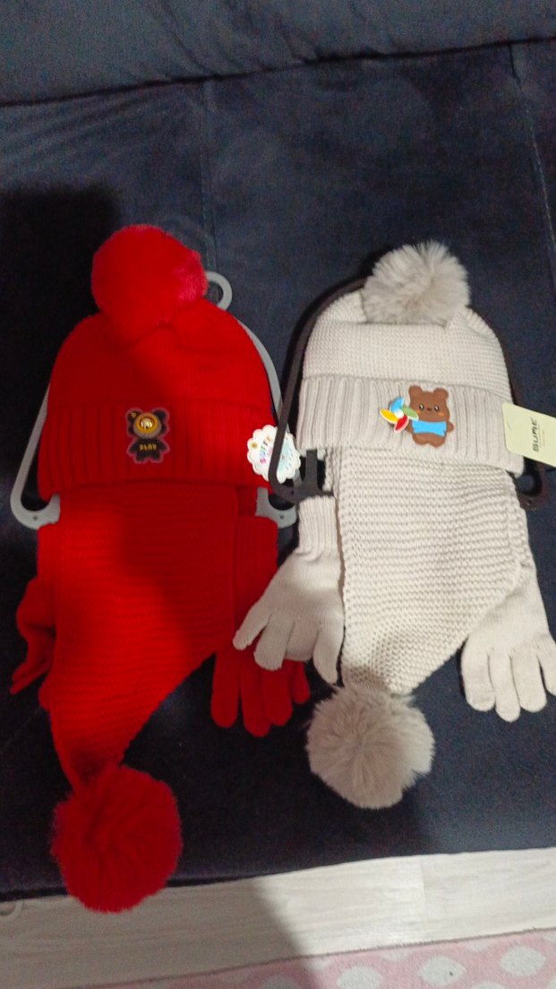 Renkli kırmızı ve beyaz hazır çocuk bere, atkı ve eldiven seti, nakışlı ayıcık detayları ve yumuşak ponponlarla. Sıcak tutan polar kumaştan yapılmıştır. kırmızı ısıklıdır