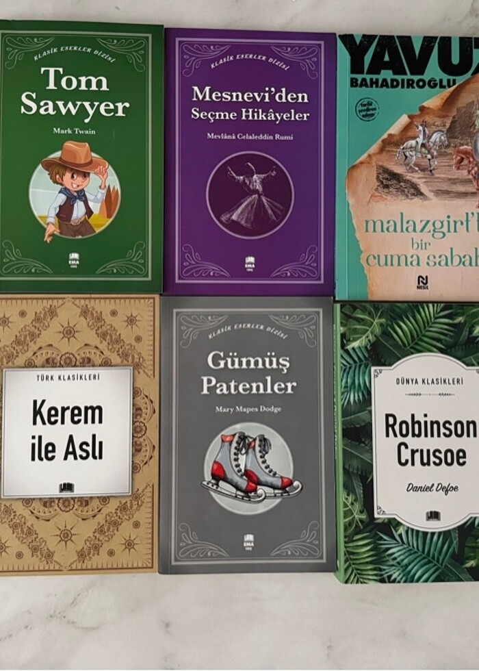 Balonla Beş Hafta Jules Verne, Tom Sawyer Mark Twain, Mesnevi’den Seçme Hikayeler, Yavuz Bahadıroğlu Malazgirt’te bir cuma sabahı, Çılgın Hayvanlar Yusuf Asal, Bilimin Öncüleri Bir Dünya Gezegeni İbni Battûta, Kerem ile Aslı, Gümüş Patenler, Robinson Crusoe Daniel Defoe Kitapların hepsi temiz ve yeni gibidir. 40 TL adet fiyatıdır. Kitaplardan almak isteyenler yeni oluşturacağım linkten alabilir