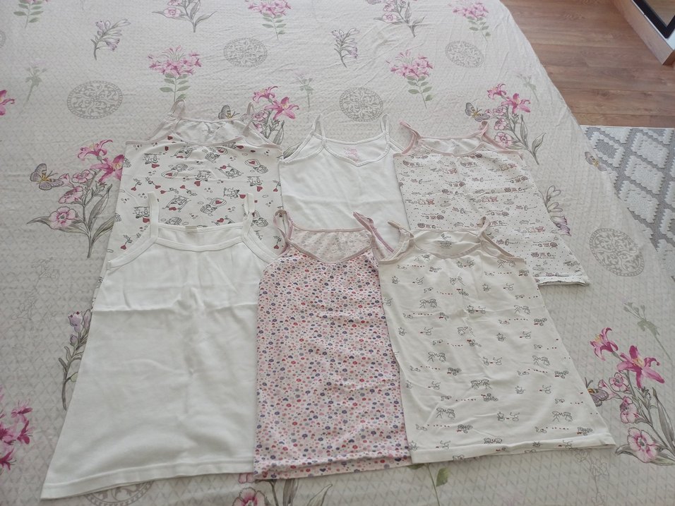 Pastel renklerde, düz beyaz ve çeşitli desenli çocuk iç atletleri seti. Yumuşak ve rahat kumaştan üretilmiştir.