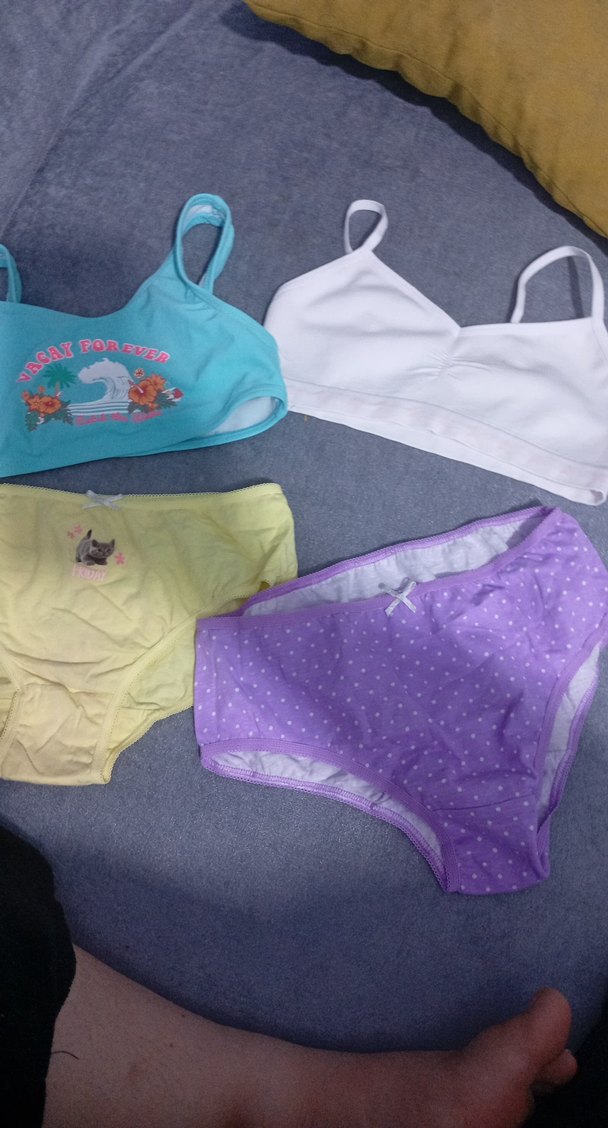 Çocuklar için pastel renklerde, yumuşak kumaşlı iki sütyen ve iki çift iç çamaşırından oluşan set. iki adet kilot bir adet yarim atlet bir bikini üstü