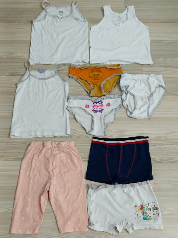 Beyaz askılı tişörtler, renkli külotlar ve hafif desenli pembe pantolonlardan oluşan çocuk iç giyim seti. Rahat ve sade tasarımlar. 9 parça fiyatıdır