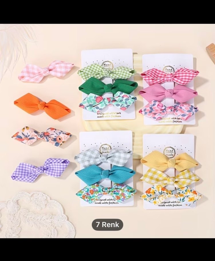 Çocuklar için 7 renkli, pastel tonlarda fiyonk ve çeşitli bağlama desenli bohem tarzda saç tokaları seti.