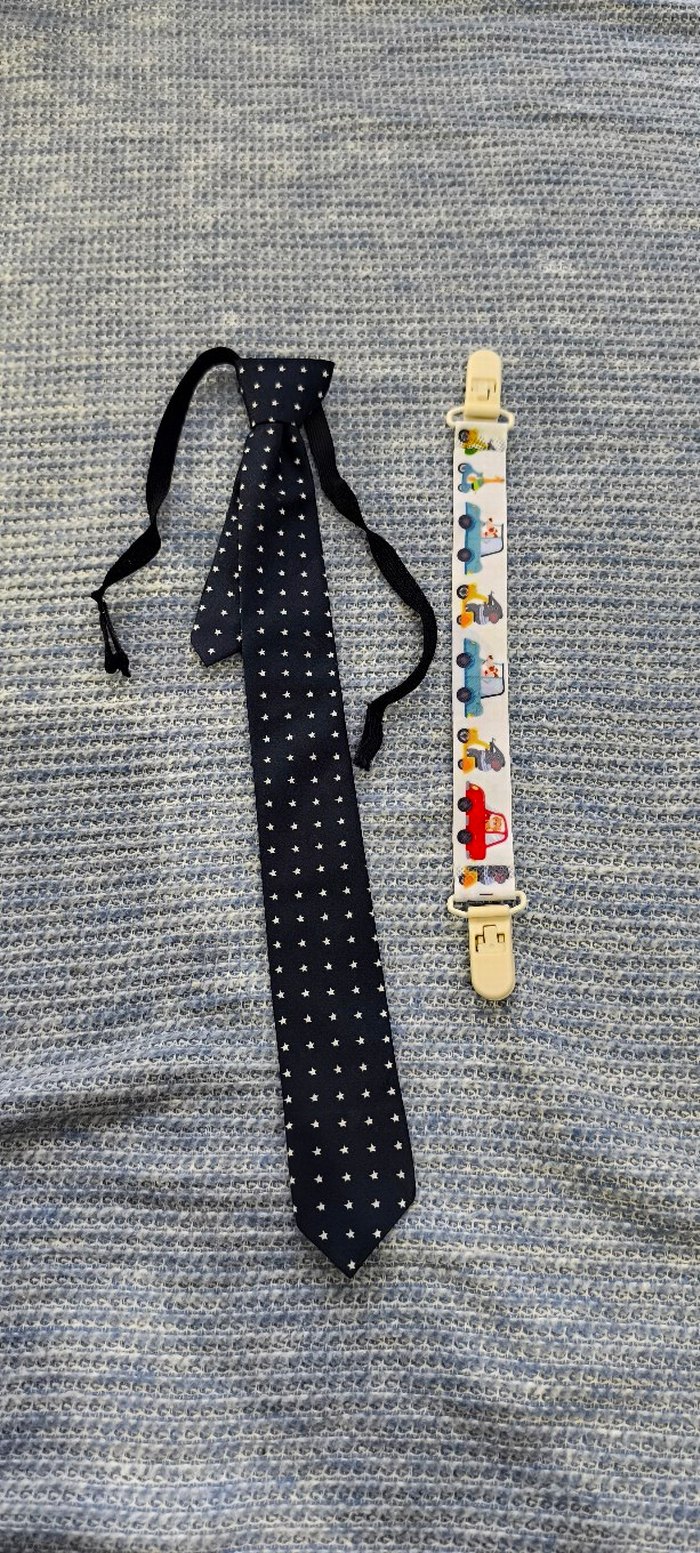 Bağlamalı, gri tonlarda bağlamalı tekstil kravat ve renkli araç desenli klipsli askı seti.