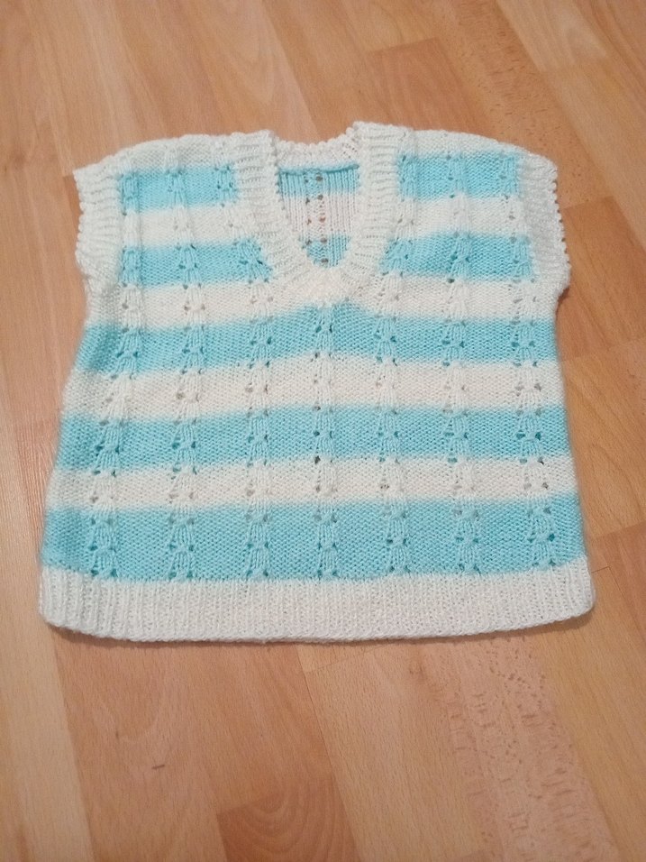 Çocuklar için kolsuz, V yakalı, bol kesim örgü süveter. Beyaz ve açık mavi pastel çizgili, yumuşak ve rahat dokuda. Bohem tarzına uygun.