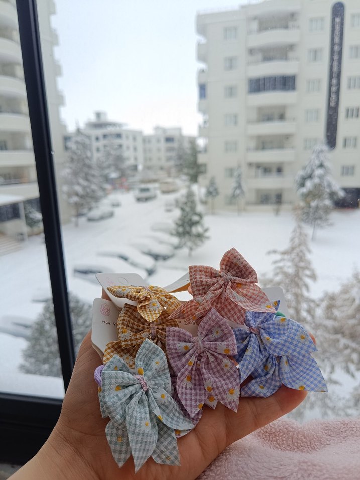 Çocuklar için pastel renklerde, bohem tarzda fiyonk desenli saç tokaları.