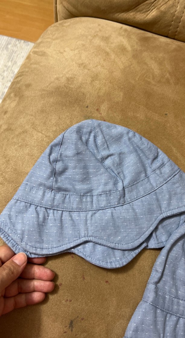 Çocuklar için yumuşak denim kumaştan, gri tonlarda sade ve bohem tarzda fırfırlı kenar detaylı mavi şapka.