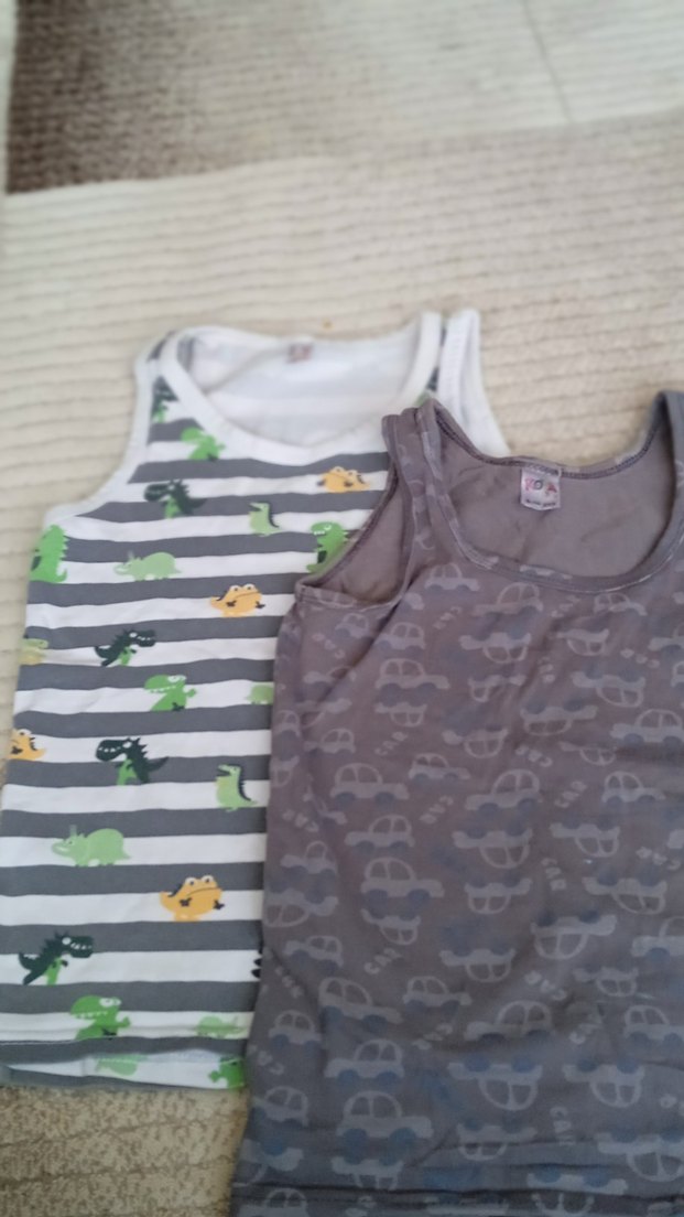 Gri araba baskılı ve gri-beyaz çizgili dinozor desenli iki çocuk içliği. Yumuşak ve rahat kumaş.
