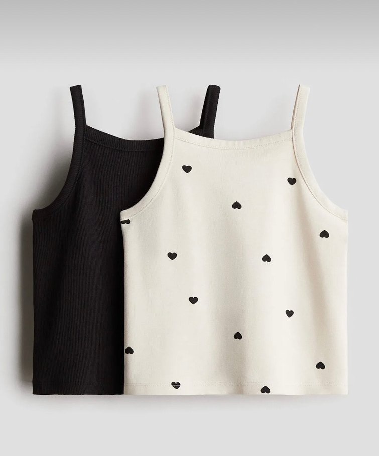 İnce askılı, yumuşak dokulu çocuk içlik ikili set. Beyaz renkli, küçük siyah kalp desenli ve siyah düz model.