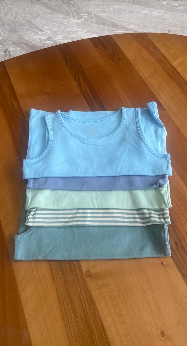 Yumuşak kumaştan yapılmış, açık mavi, yeşil ve çizgili desenli pastel renklerde çocuk içlikleri seti. Katmanlama için uygundur.