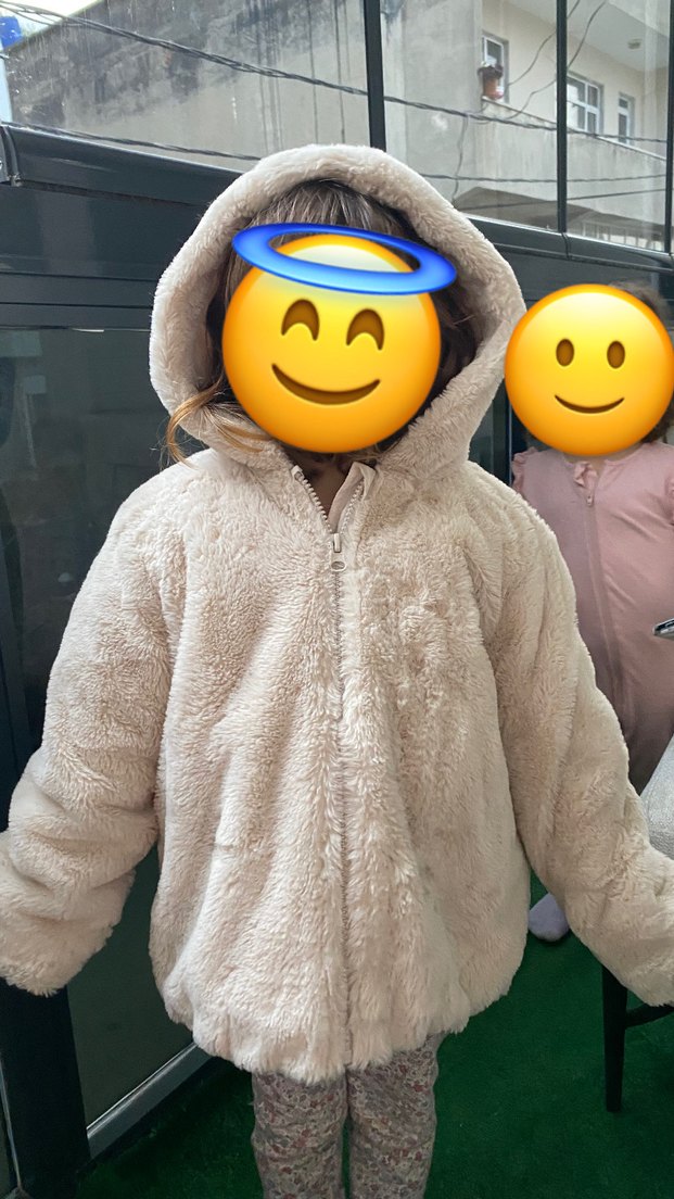Çocuklar için kahverengi kapüşonlu kaban, yumuşak ve sıcak kumaş, kürk detaylı, uzun kollu ve bol kesimdir. Günlük kullanım için uygundur. 2 adet mont