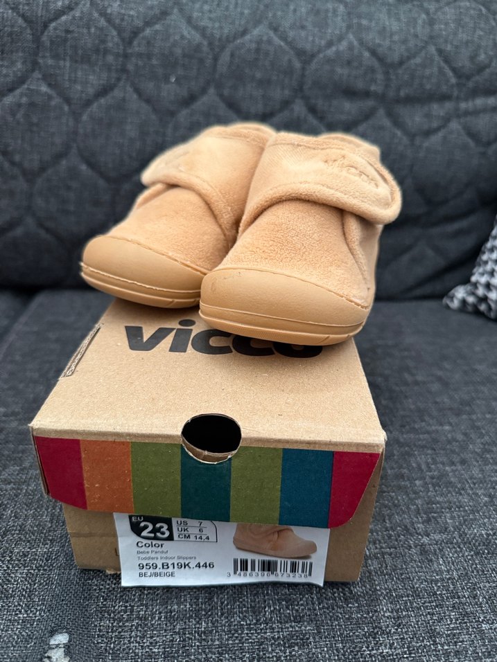 Kahverengi, peluş malzemeden, cırt cırtlı çocuk ev terliği. Baskılı desenli ve normcore tarzında. Numara 23.