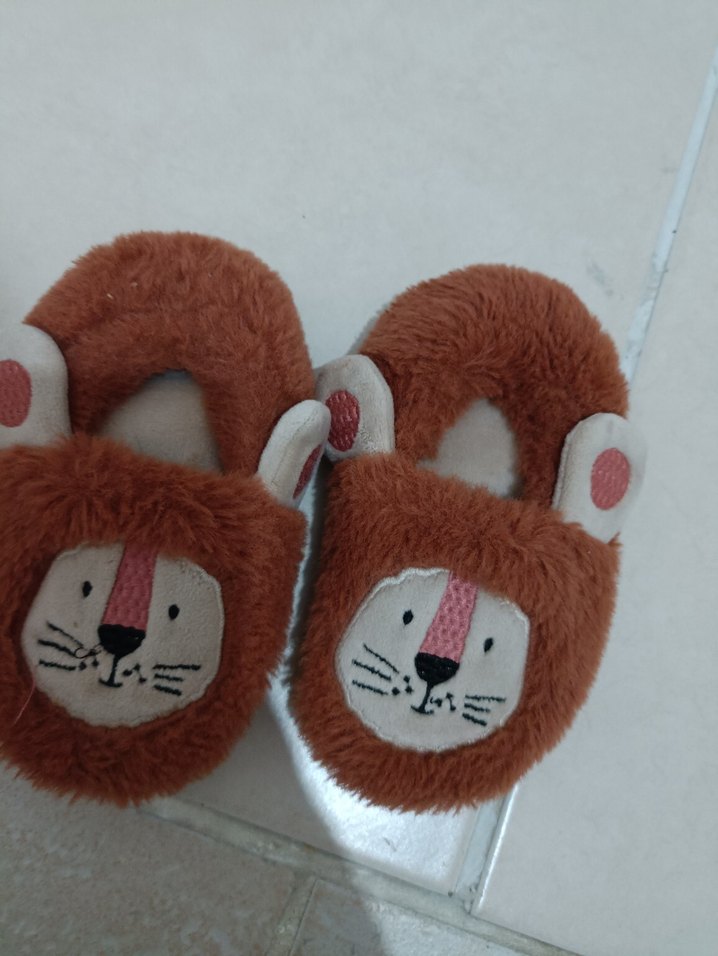 çocuklar icin kahverengi, yumuşak ve kürklü detaylı sıcak ev terliği, sevimli hayvan yüzü deseniyle rahat ve konforlu.