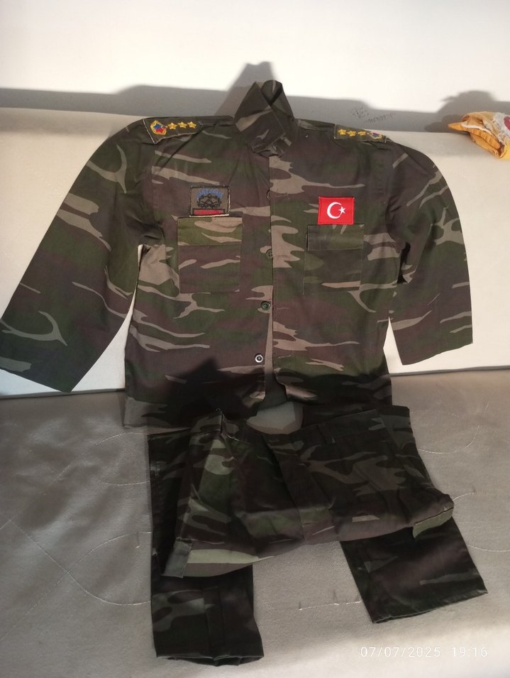 Çocuklar için koyu haki kamuflaj desenli, uzun kollu, kemerli ve regular fit ceket ve pantolon takımı. Notlu yaka ve Türk bayrağı detaylıdır.