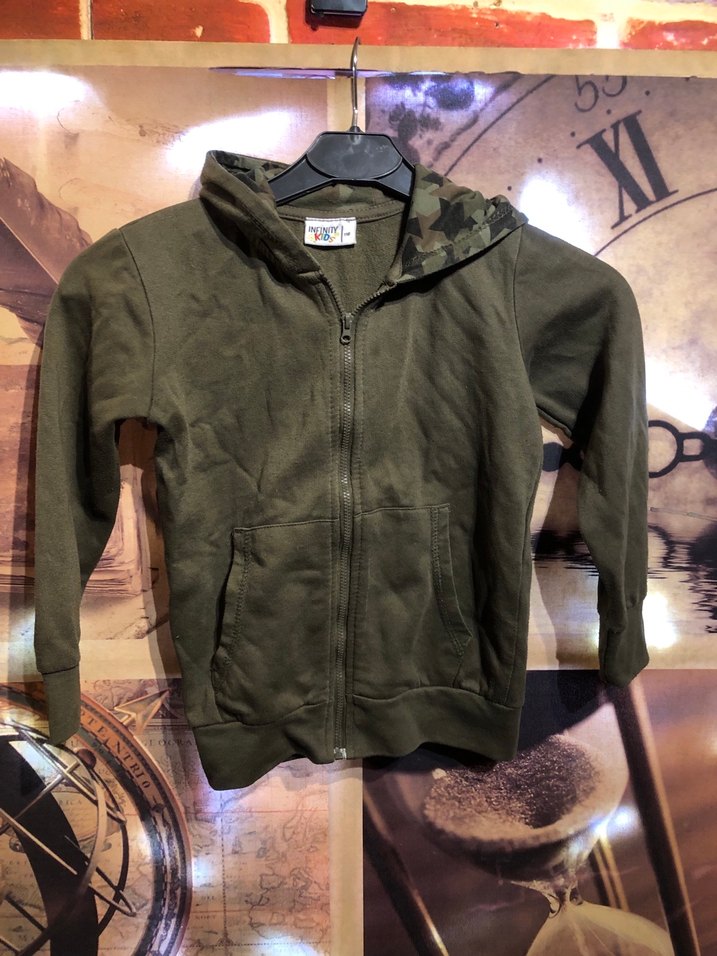 Haki renkte, uzun kollu, kapüşonlu ve fermuarlı erkek çocuk sweatshirtü. Kamuflaj desenli, rahat ve sıcak kumaştan, günlük sokak stili için uygun. 116