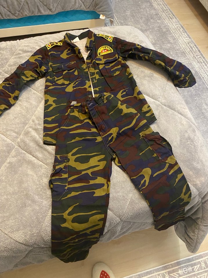 Koyu renkli çok renkli kamuflaj desenli, uzun kollu, kemerli ve yaka detaylı çocuk streetwear takımı.