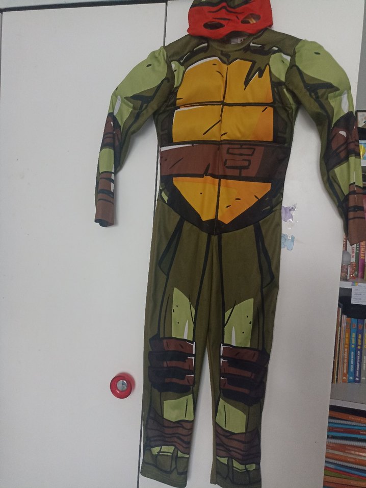 Çocuklar için baskılı, dar kesim, boğazlı ve kemerli bir kostüm. Strappy kollu ve koyu yeşil renkte, pop kültür esintili.