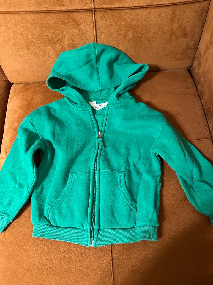 Koyu yeşil renkte, kapüşonlu ve fermuarlı, uzun kollu, yumuşak dokulu çocuk sweatshirtü. Sokak stiline uygun sade tasarım.