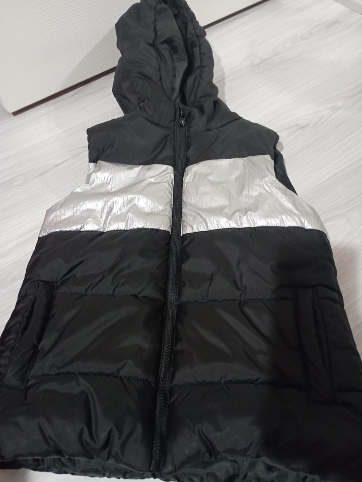 Unisex çocuk için kapüşonlu, fermuarlı, yüksek yakalı, siyah ve gri renklerde, yumuşak ve sıcak dokulu, dar kesim yelek, etiketinde isim yazılı okulda kullanıldıgı için herhangi kusuru yoktur. 9-10-11 yaş /140-146 cm.