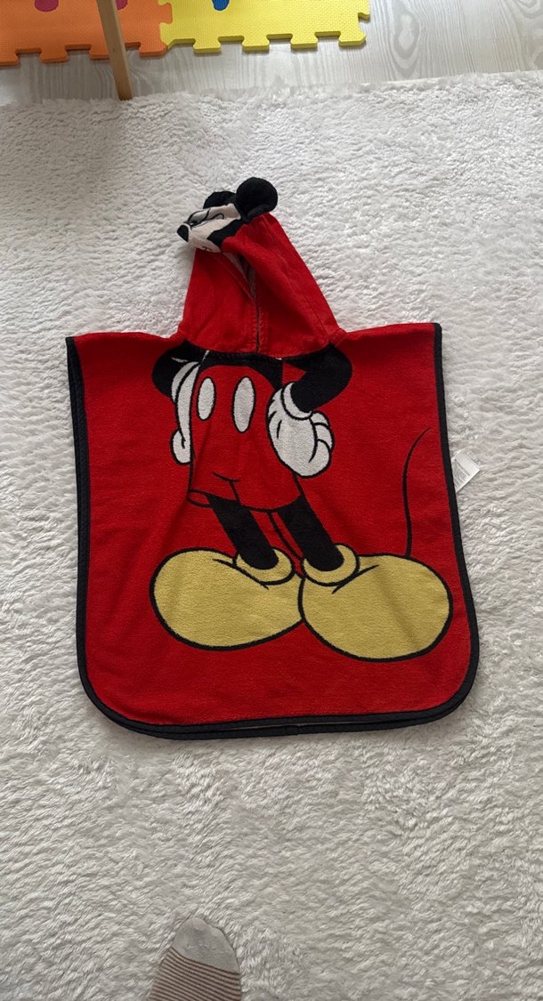 Renkli kırmızı çocuk bornozu, baskılı desen ve karakter detaylı kapüşonlu, yumuşak ve emici kumaştan üretilmiştir.