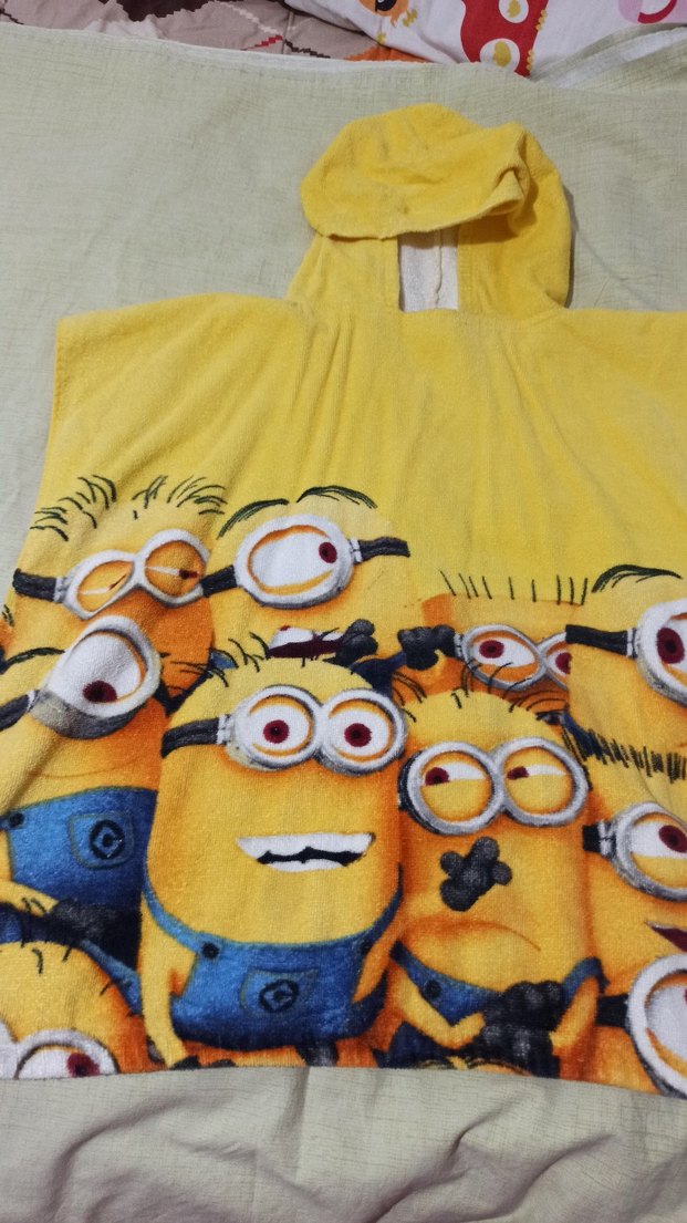 Renkli sarı kapüşonlu bornoz, Minyonlar baskılı, yumuşak ve emici kumaştan yapılmıştır, çocuklar için uygundur.