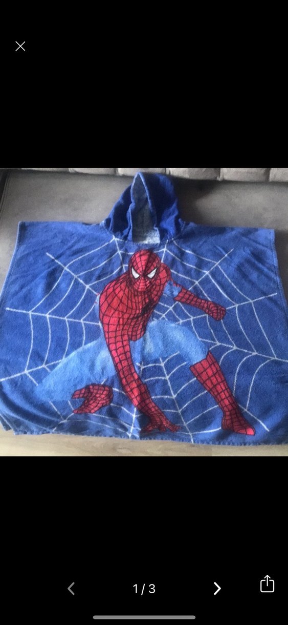 Renkli mavi kapüşonlu bornoz, Örümcek Adam baskısı ve ağ deseniyle. Yumuşak, emici kumaştan yapılmıştır. ️