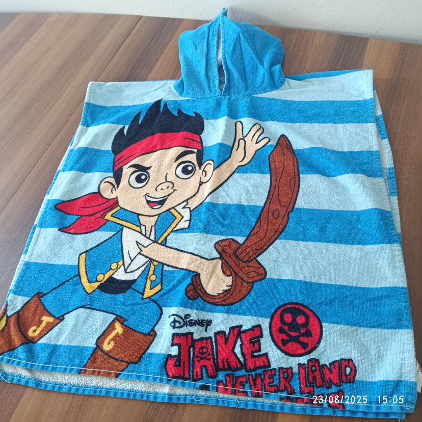 Mavi çizgili kumaş üzerinde çizgi film korsan karakter baskılı, kapüşonlu çocuk bornozu. Yumuşak ve emici kumaştan üretilmiştir.