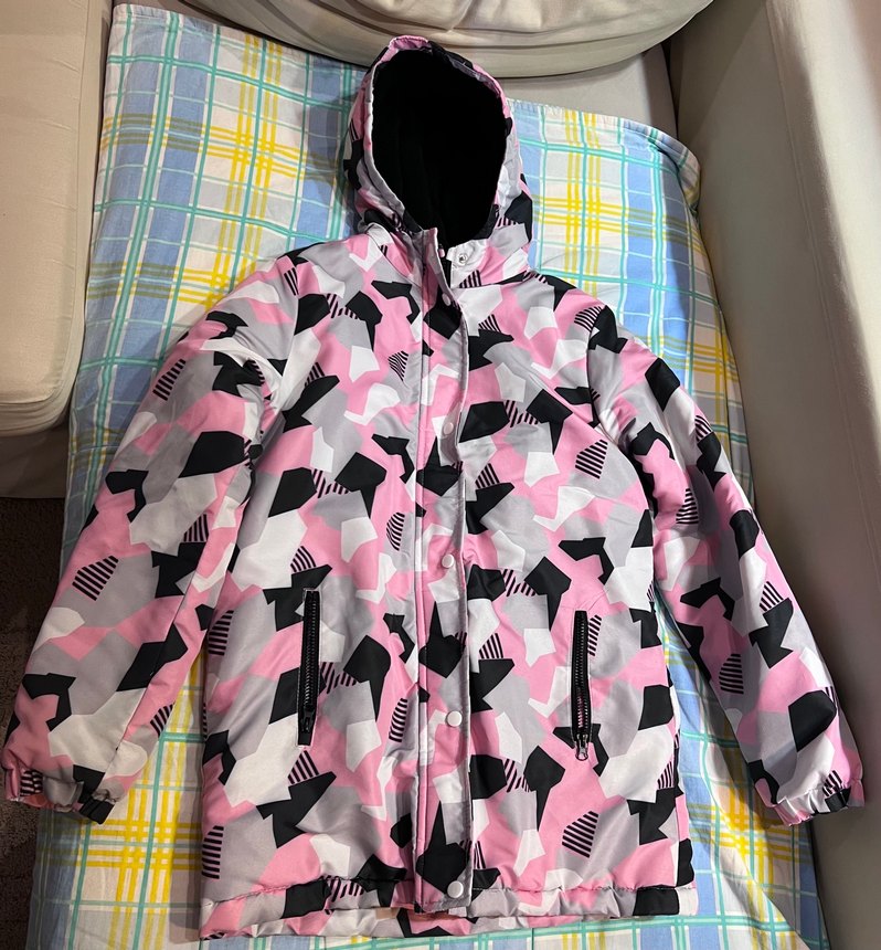 Pembe tonlarında soyut desenli, kapüşonlu ve fermuarlı kız çocuk ceketi. Sentetik kumaştan, sokak tarzına uygun, fit kesim.