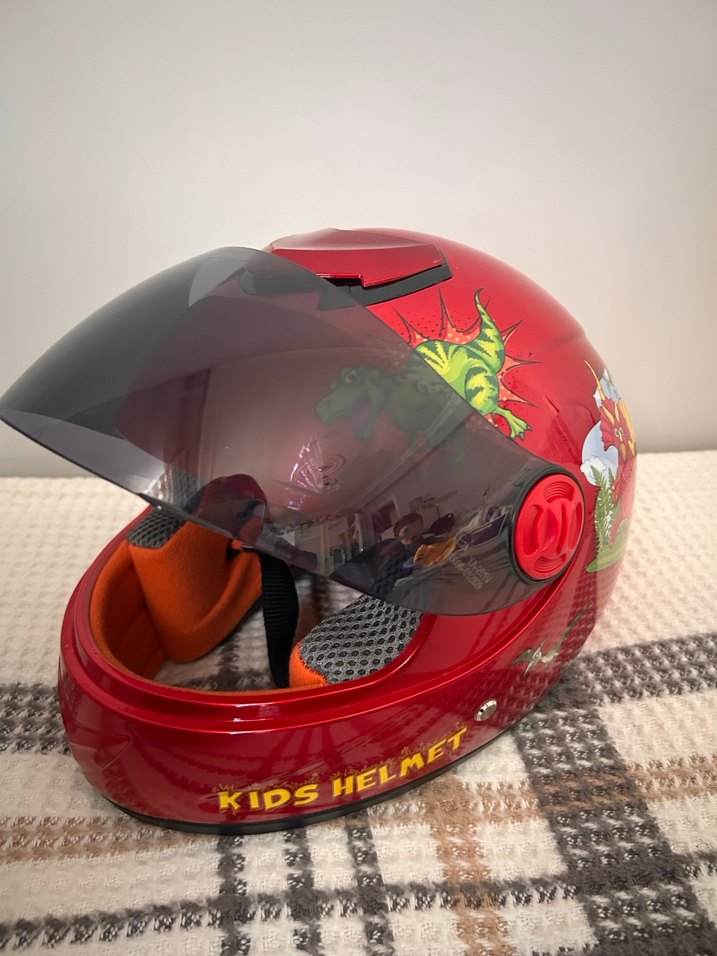 Renkli baskılı kırmızı motosiklet kaskı, plastik malzemeden üretilmiş ve tokalıdır. Grunge punk tarzını yansıtır. ️