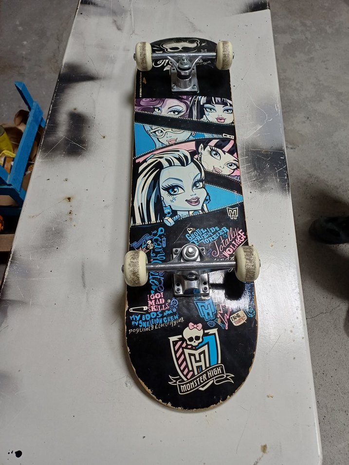 Monster High grafiklerine sahip koyu renkli, çok renkli çocuk kaykayı, beyaz tekerleklerle.