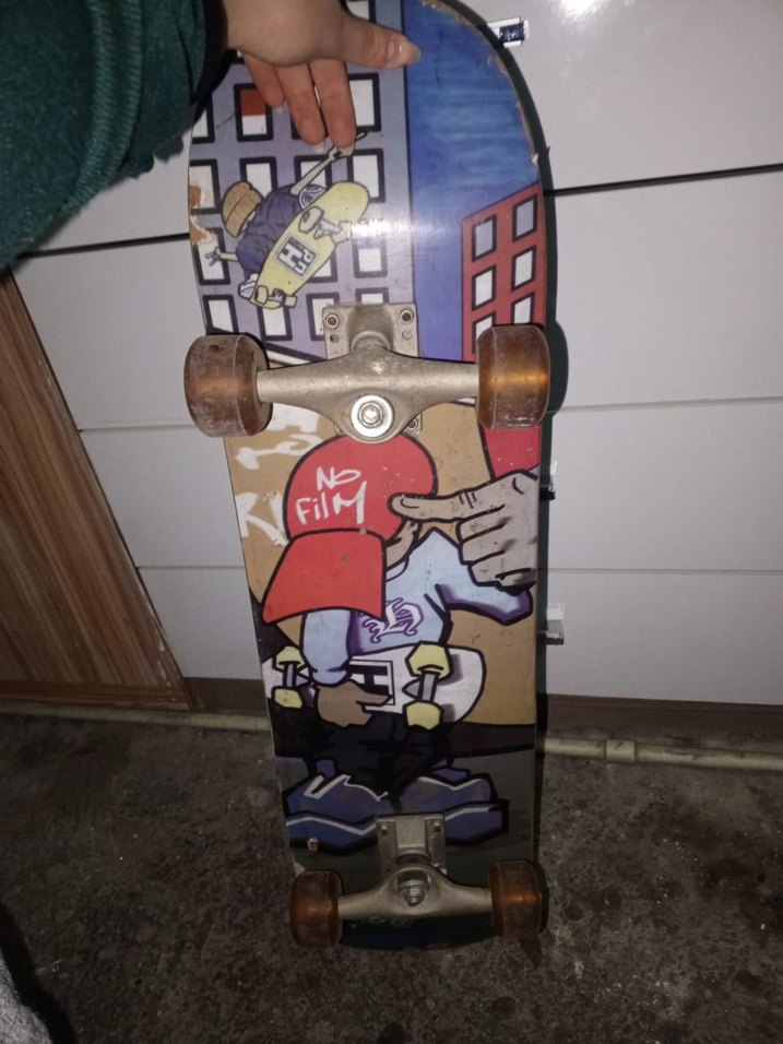 Renkli çizgi film desenli, koyu gri çocuk kaykay kaydırağı. Dayanıklı tekerlekleriyle dış mekan kullanımı için uygundur.