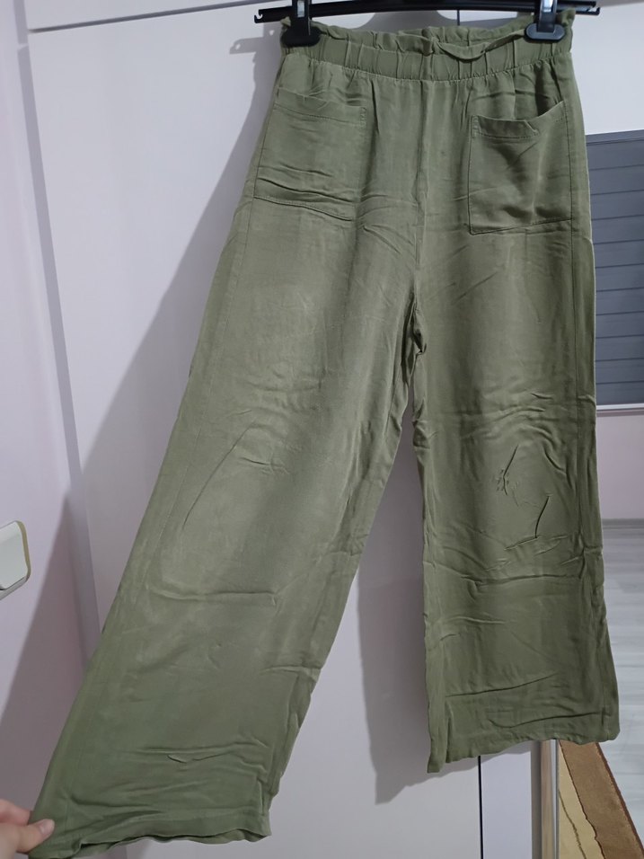 12-13 yaş çocuklara göre keten kumaştan, salaş kesim ve elastik bel bandına sahip, cep detaylı haki renk pantolon. Günlük rahat kullanım için uygun. kırışık olduğu için fotoğraflarda biraz kötü çıkmış ama ütü yaparsanız mükemmel bir keten pantolon ayrıca aşırı rahattır, az kullanıldı. tek sıkıntısı ön kısmında son fotoğrafta gördüğünüz gibi bir leke var yıkanınca geçer mi bilmiyorum, geçmezse de zaten ben fiyatı olabildiğince uyguna koyacağım, almayı düşünüyorsanız bana yazabilirsiniz fiyatı konuşup daha da düşürebilirim benim için sorun değil hiç