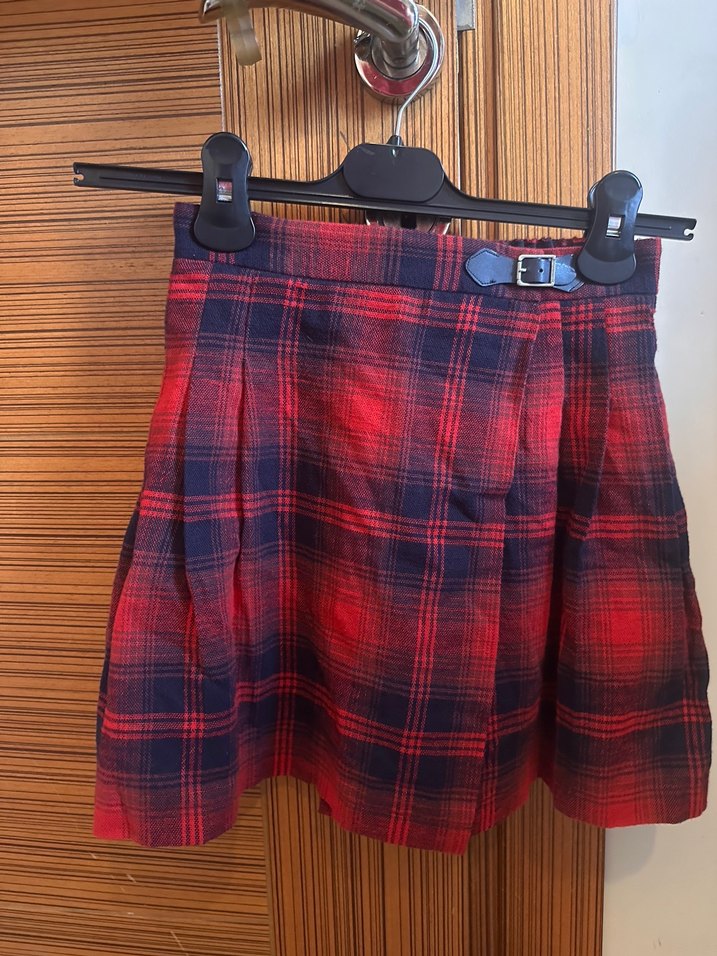 Kemer tokası detaylı, koyu kırmızı ekose desenli, bol kesim midi etek. Vintage tarzıyla dış mekan kullanımı için uygundur.
