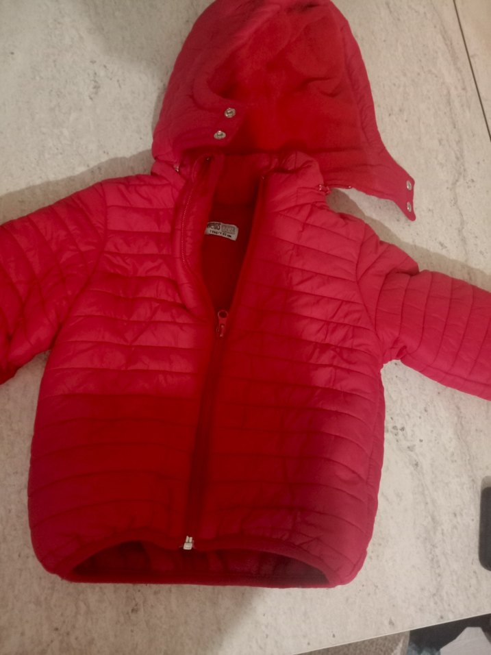Kız çocukları için kırmızı, fermuarlı ve yakası kesimli mont. Yumuşak ve sıcak kumaştan, çıkarılabilir kapüşonlu, sokak stili için uygun.