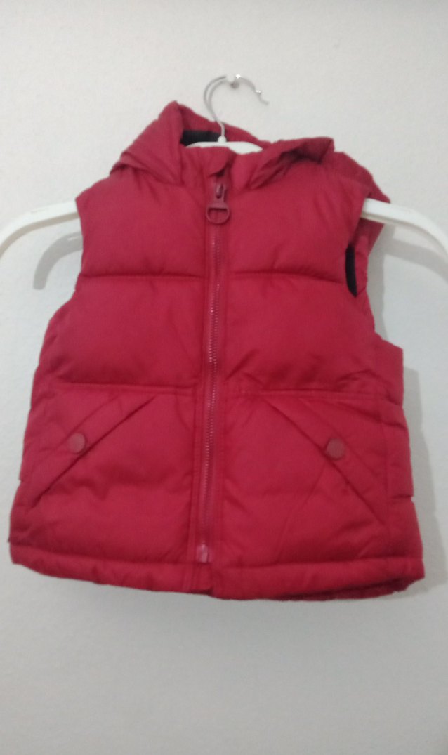 çocuklar için kırmızı, kapüşonlu şişme yelek. Düğmeli cepler ve fermuarlı ön kapama ile sokak stiline uygun, sıcak tutan kumaş.