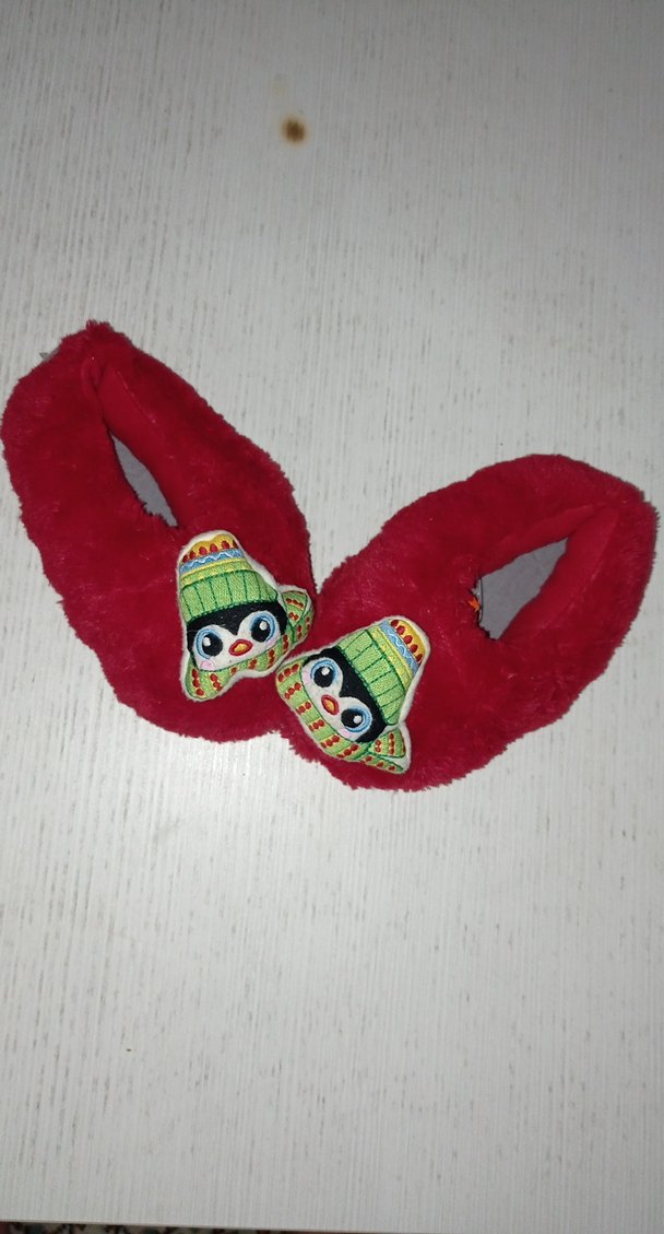 Renkli kırmızı çocuk terlikleri, nakışlı pop kültür motifleri ve örme detaylarla bohem ve retro tarzını yansıtıyor. Yumuşak kürk dokusu ile sıcak tutar.