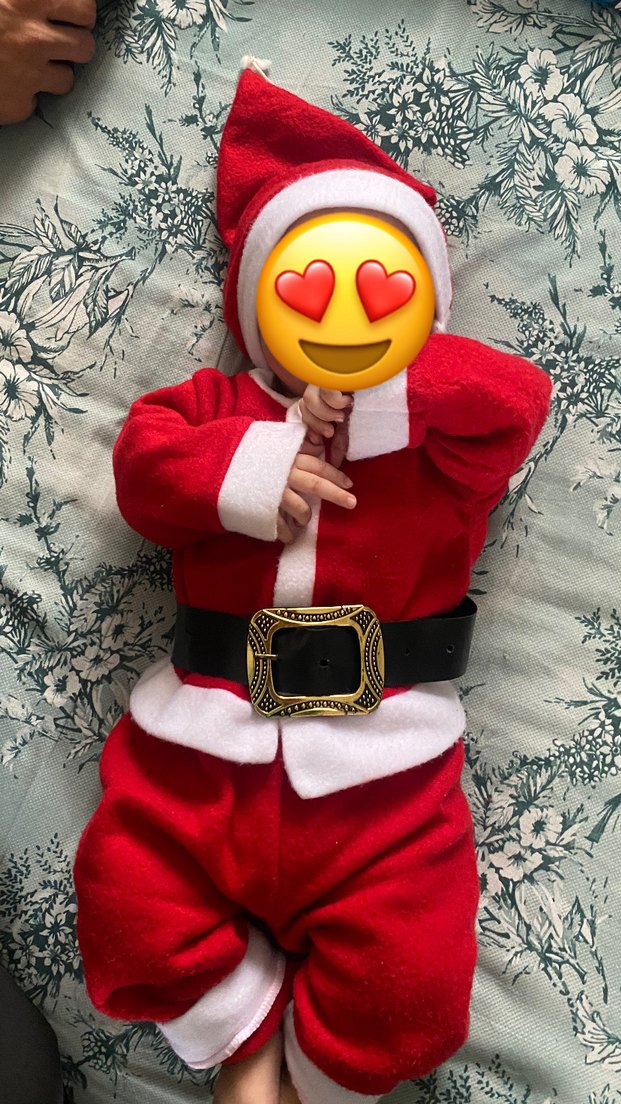 Kemer tokalı, sıkı oturan kırmızı çocuk Noel Baba kostümü ve şapka, renkli baskılı desenle tamamlanmıştır.