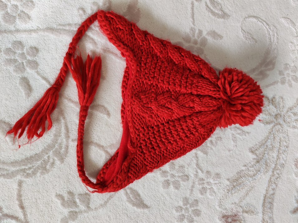 Kırmızı örgü çocuk şapkası, bohem tarzda örgü desenleri ve püsküllerle, yumuşak triko kumaştan üretilmiştir. Uniseks bir renkte beredir.