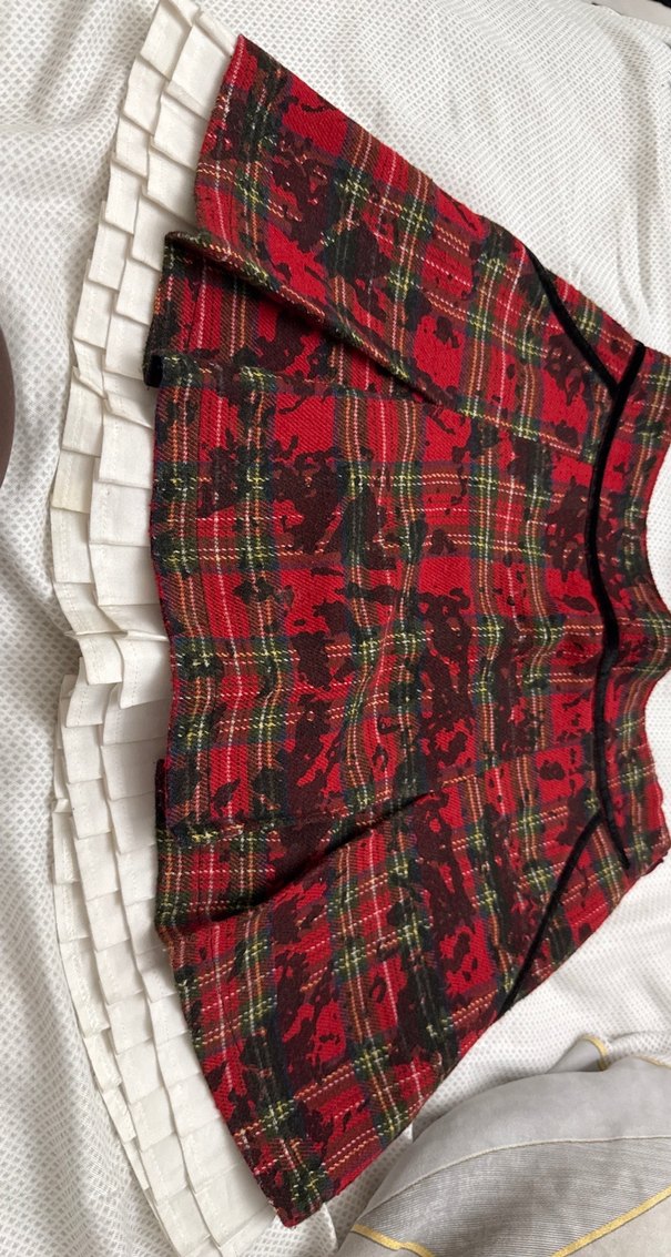 Çocuk için kırmızı desenli, pilili ve beyaz katmanlı etek ucu detaylı, normal boy midi etek. Dış mekan kullanımı için uygundur.
