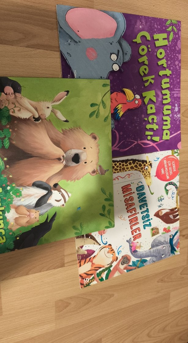 Renkli hayvan çizimleri ve hikayeler içeren çocuk kitapları.