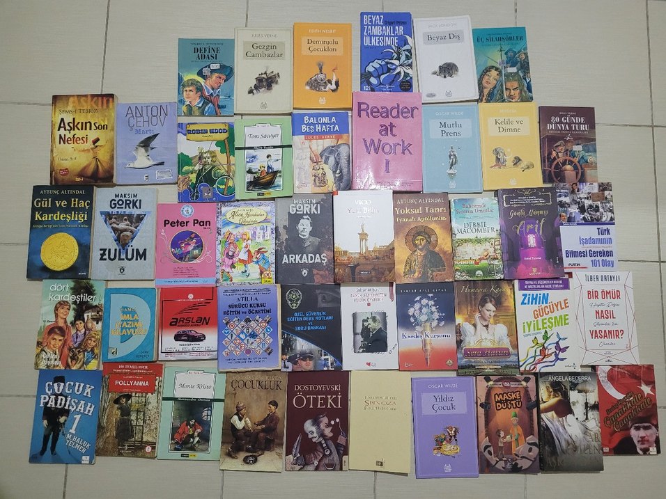 Peter Pan, Dostoyevski'nin Öteki'si, Mutlu Prens gibi kitapların bulunduğu çocuk kitapları koleksiyonu.