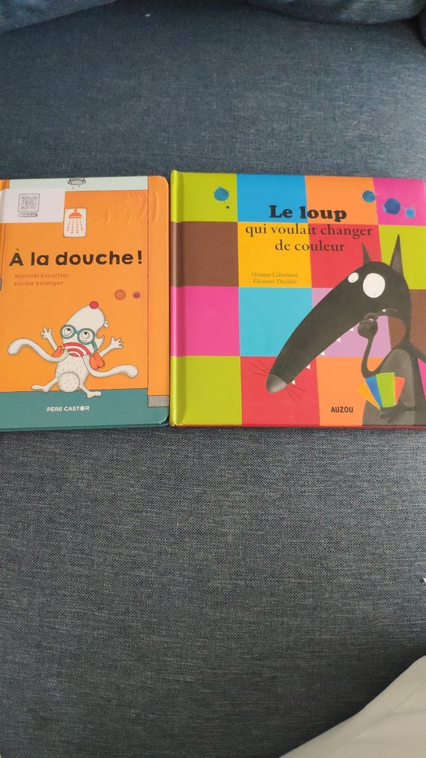 Fransızca iki çocuk kitabı: Karakterli 'À la douche!' ve renk değiştirmek isteyen kurt 'Le loup qui voulait changer de couleur'. Yayıncı AUZOU.