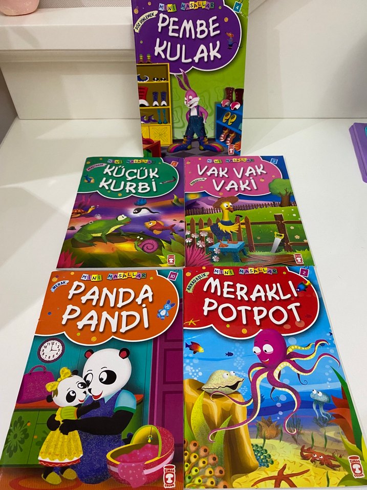 Pembe Kulak, Küçük Kurbi, Vak Vak Vaki, Panda Pandi ve Meraklı Potpot adlı renkli çocuk kitapları seti.