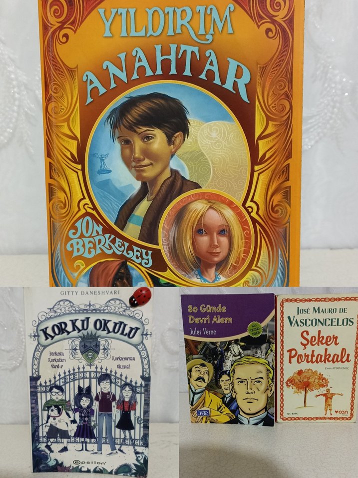 Macera ve korku temalı çocuk kitapları seti, 'Yıldırım Anahtar' ve 'Korku Okulu' gibi kitaplar içerir. Yıldırım Anahtar: Çizgi Kurgu kitabı 247 sayfa Çölde geçen bir kurgusu var 80 Günde devri Alem: Kaliteli bir şekilde Türkçe'ye çevrilmiş 152 sayfa Korku Okulu: 296 sayfa Şeker Portakalı: 180 sayfa