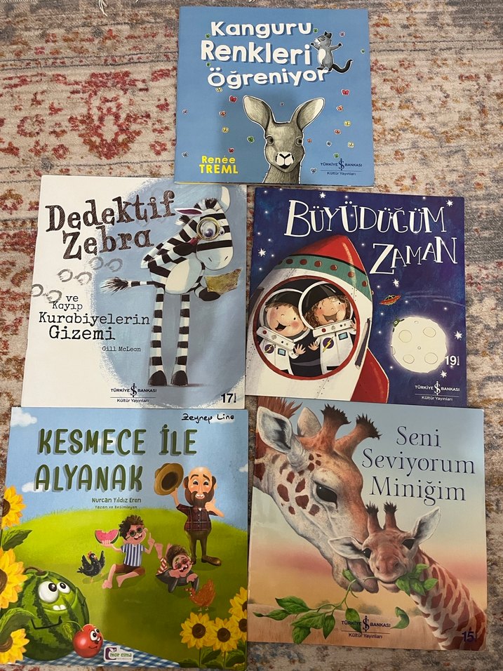 Renkli çizimlerle kanguru, zebra, dedektif, zaman ve sevgi temalı 5 çocuk kitabı seti.