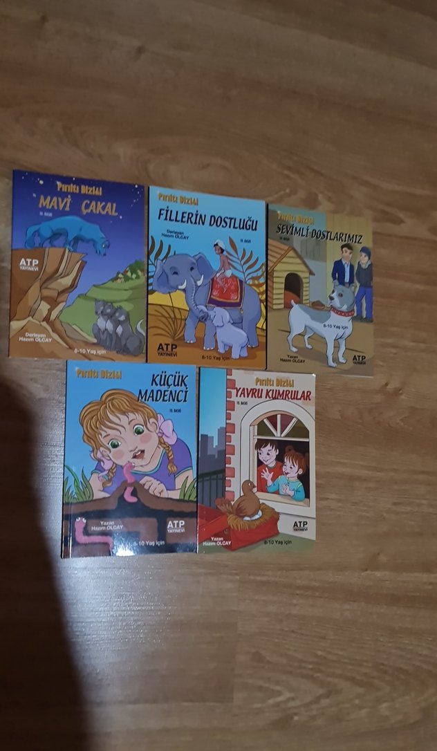 "Mavi Çakal," "Küçük Madenci," "Yavru Kumrular," "Fillerin Dostluğu" ve "Sevimli Dostlarımız" gibi hikayeler içeren 5 kitaplık çocuk seti.