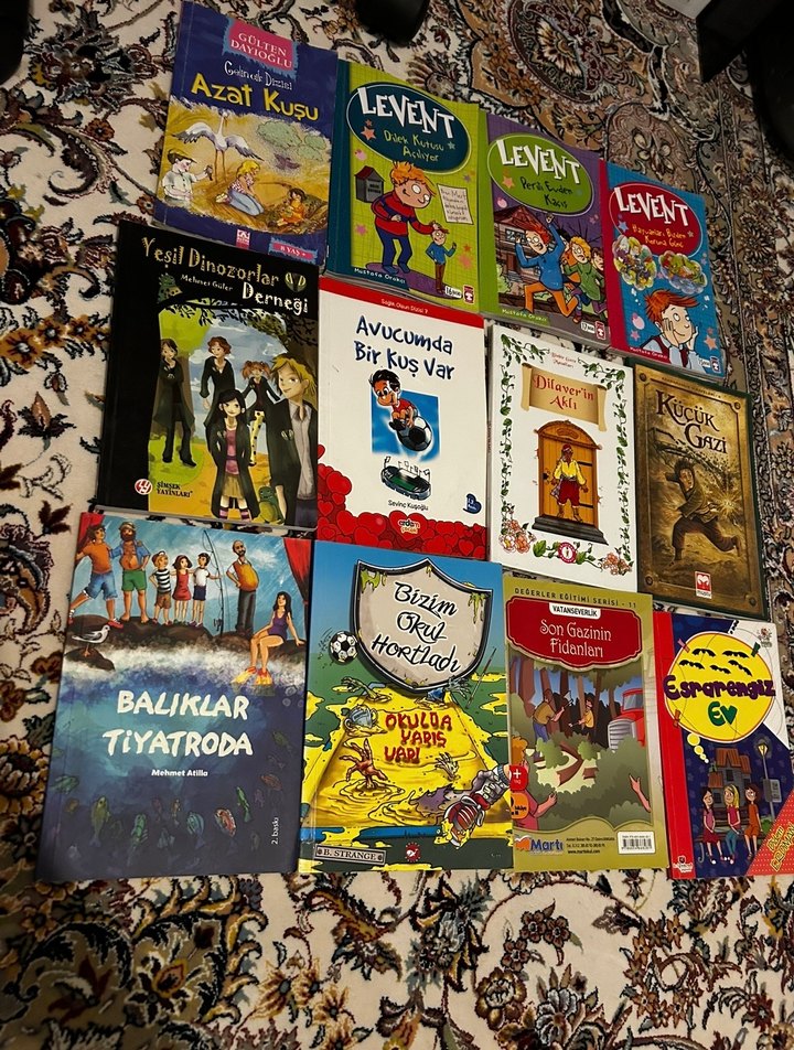 Çeşitli hikayeler içeren çocuk kitapları seti. Dinozorlar, kuşlar ve tiyatro temaları bulunur. Renkli kapaklar ve ilgi çekici çizimler içerir.