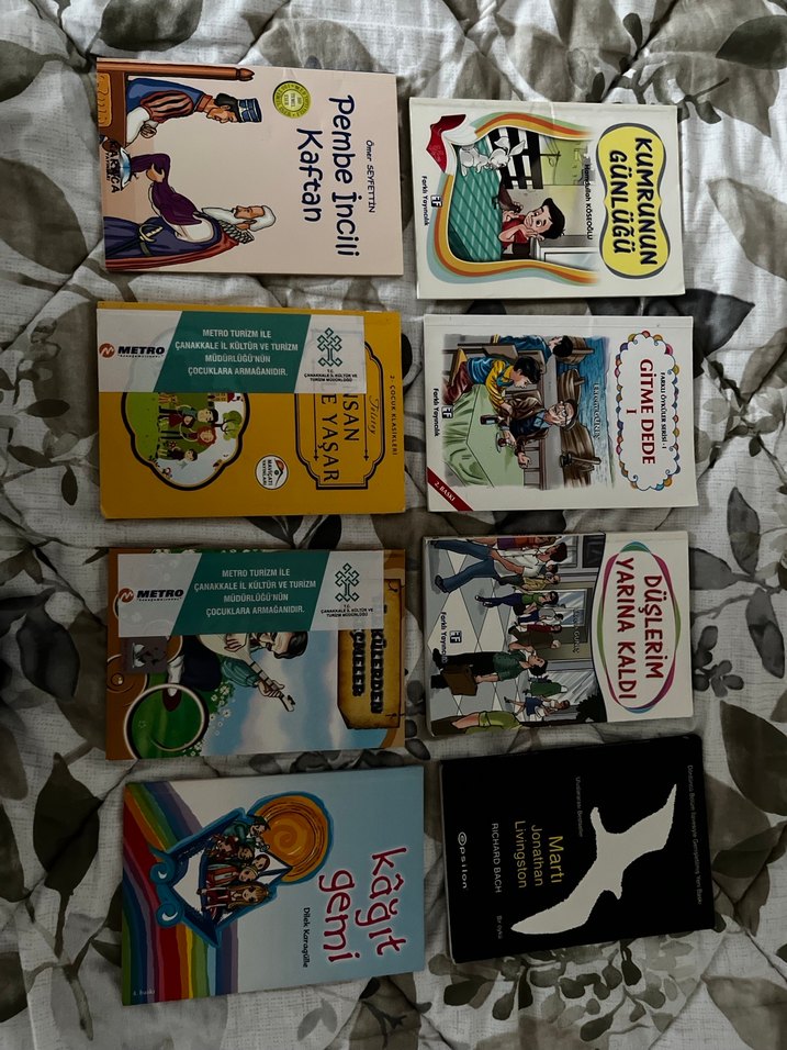 Pembe İncili Kaftan, Kumrunun Günlüğü, Kağıt Gemi gibi farklı hikayeler içeren 8 çocuk kitabı seti.