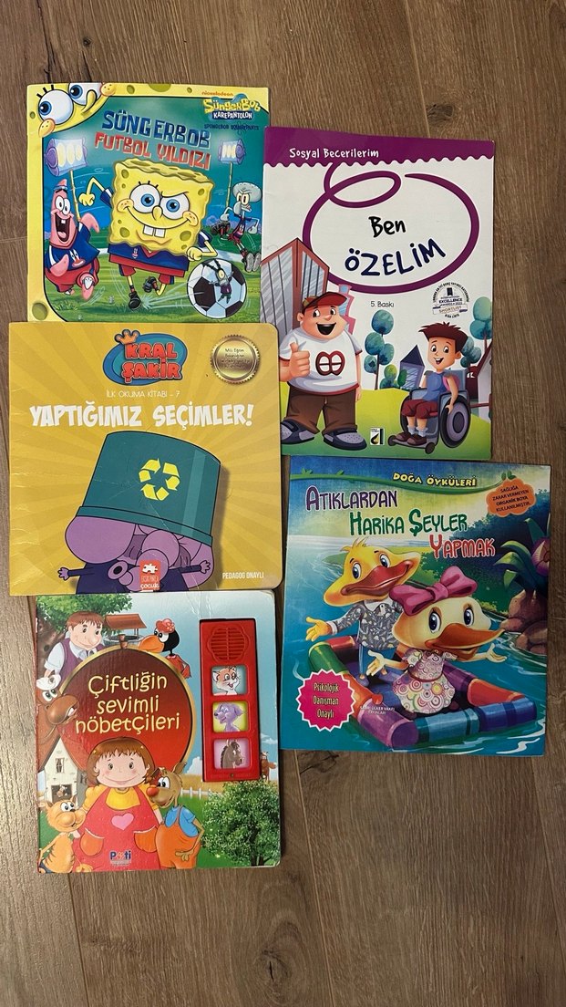 Beş kitaplık çocuk seti; geri dönüşüm, dostluk ve macera temalı, renkli çizimler ve eğlenceli hikayeler içerir.