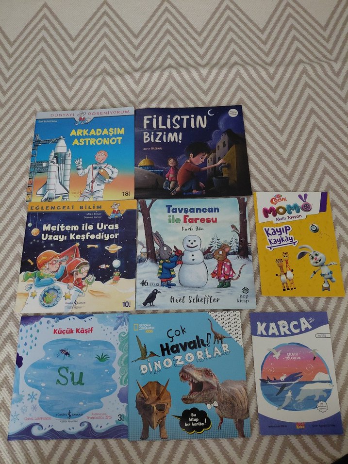 Astronot, dinozorlar, su ve macera temalı çocuk kitapları seti. Tavsancan ve Karca gibi karakterlerle keşif ve eğlence dolu hikayeler içerir.Sayfaları tam ve sağlamdır