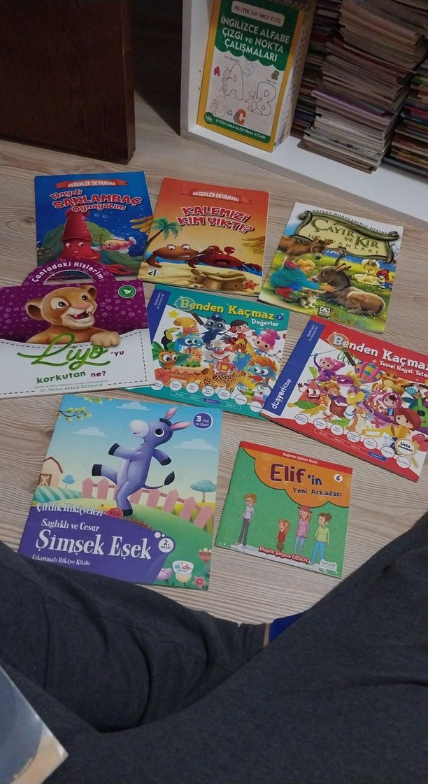 Elif'in, Şimşek Eşek ve Kaçmazo gibi kitapların bulunduğu renkli ve eğlenceli çocuk kitapları seti. çoğu hiç okunmadı
